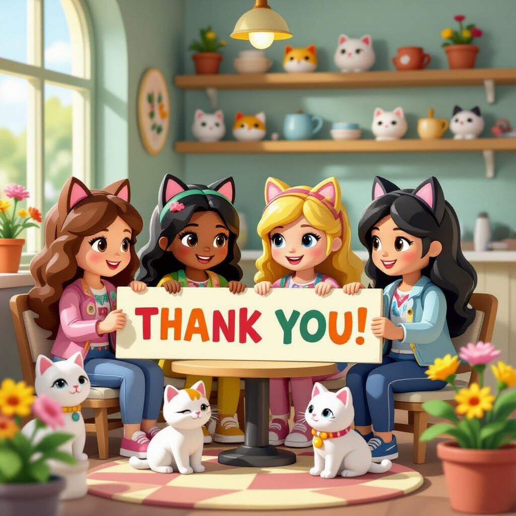 This image shows Lego Friends characters in a cat cafe holding a Thank You sign. The scene is filled with adorable cats and is rendered in a whimsical and colorful style.