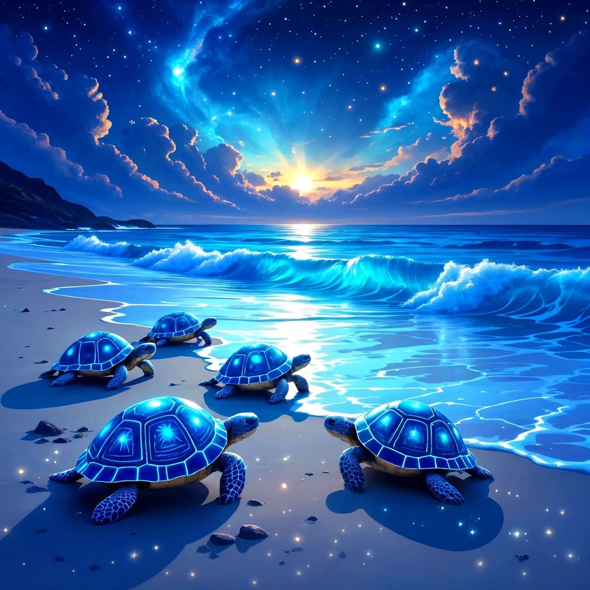 This image shows a bioluminescent ocean with crystal sands and a nebula-filled sky. Bioluminescent baby tortoises crawl towards the water in this vibrant fantasy landscape.