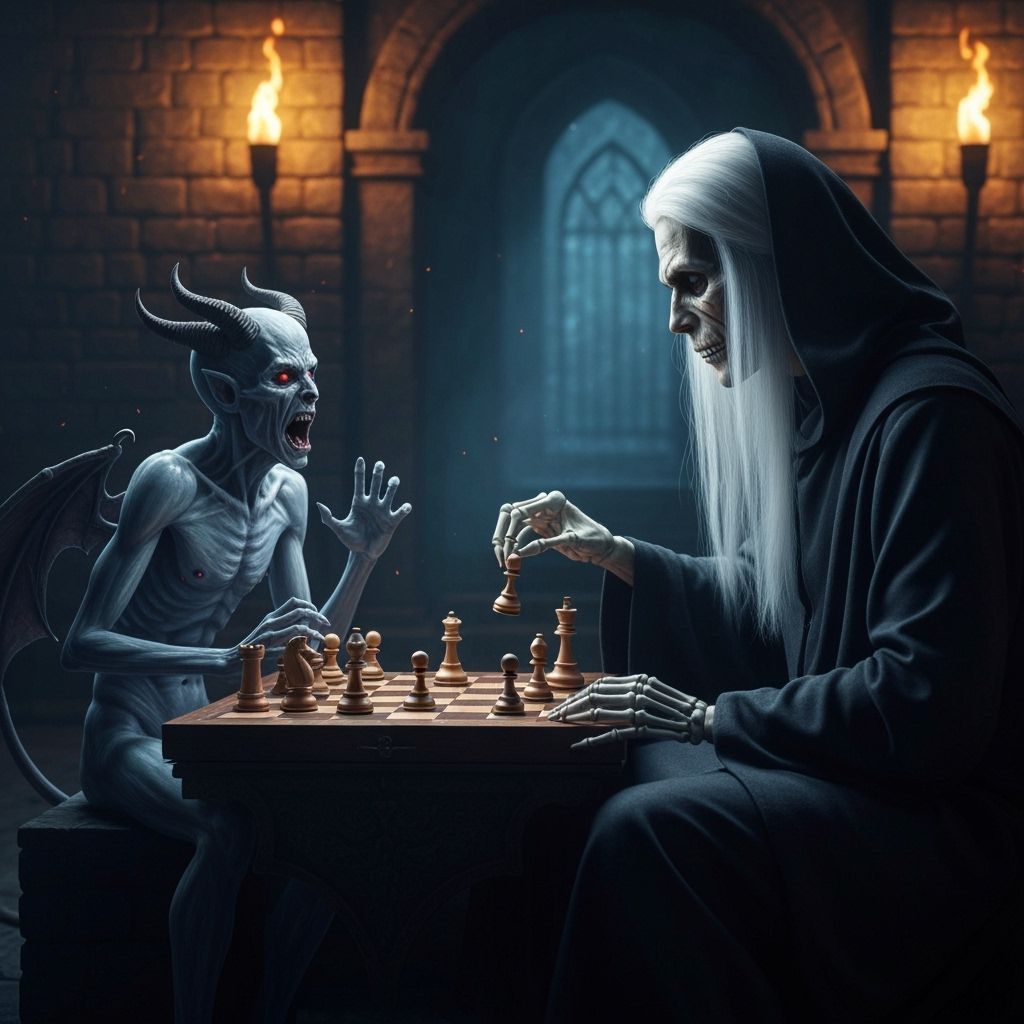 This image shows the Grim Reaper with long white hair in a chess match against a demonic soul in purgatory. The soul is in checkmate in this hyperrealistic digital artwork.