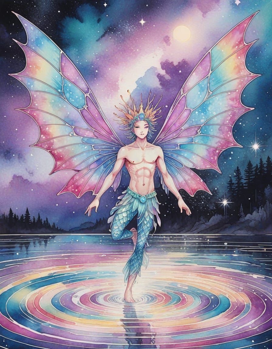 This image shows a celestial water fairy gliding over a cosmic lake. In a watercolor and ink manga style, the fairy features stained-glass wings, shimmering scales, and a starlight headdress.