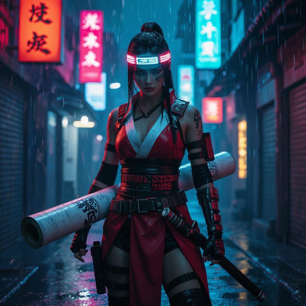 This image shows a female ninja warrior in a modernized red and white outfit, holding a glowing scroll weapon in a rain-slicked, neon-lit cyberpunk alley. Realistic textures and cinematic lighting create a moody atmosphere.