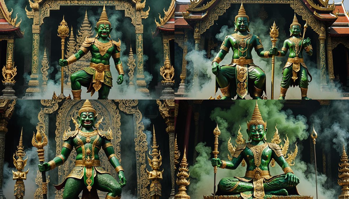 A striking picture of a towering, green and gold Thai Khon figure standing before a temple. The figure is rendered with high definition details and cinematic lighting, in a fantastical art style.