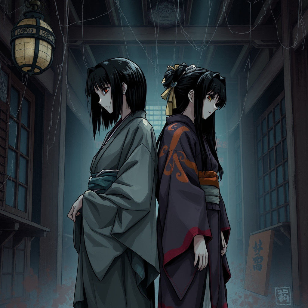 This image shows Sadako Yamamura and Kayako Saeki in tattered kimonos, back to back. The dark scene is reminiscent of anime and manga art, with horror and supernatural elements.