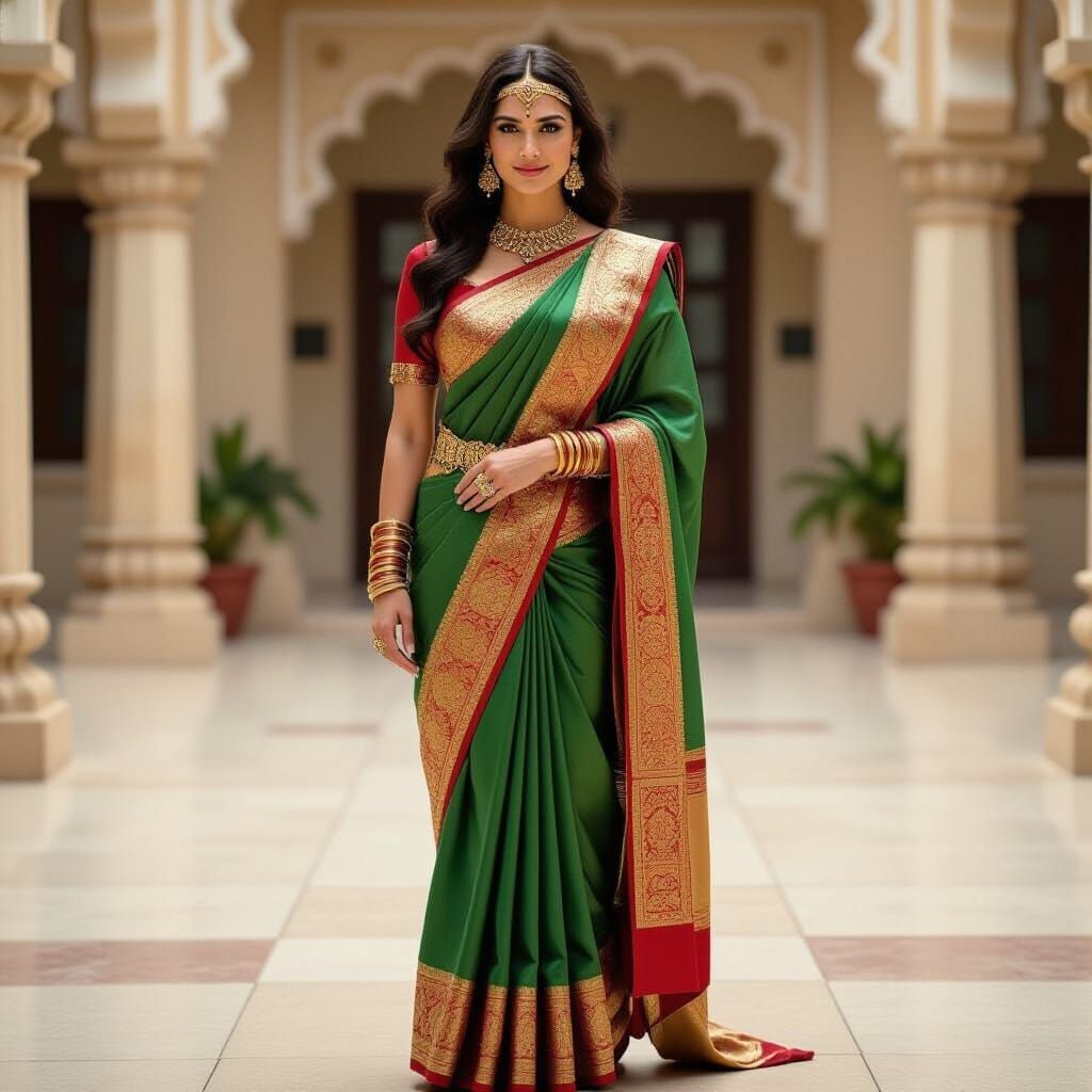 This image shows Gal Gadot in a traditional Maharashtrian Nauvari saree, styled with Wonder Woman's signature color palette. The image showcases a fusion of cultural attire and superhero aesthetics.