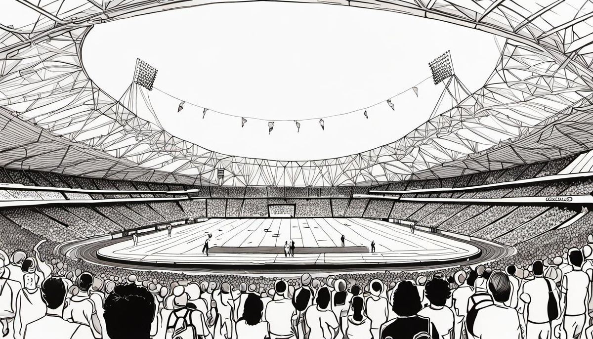 This image shows a black and white pen and ink drawing of the London stadium during the 2012 London Olympics. Captures the energy of Super Saturday.