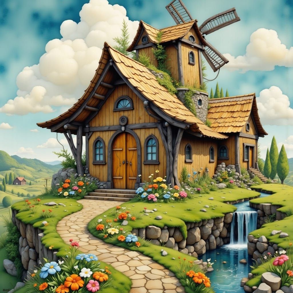 A whimsical wooden clog house being built by a woman amid vibrant flowers. Inverted watermill and stream in background. Ethereal fantasy style.