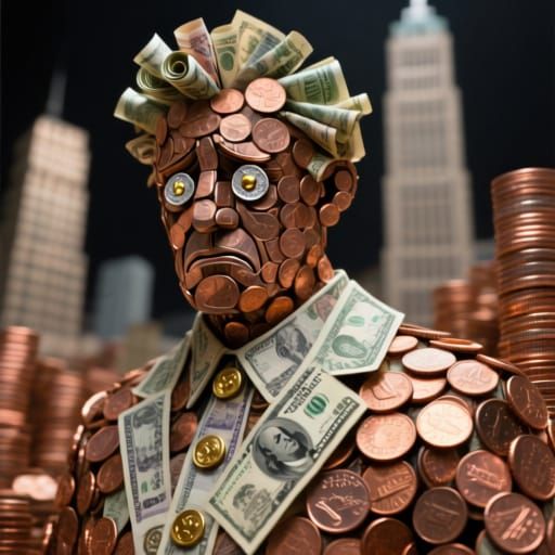 A surreal portrait of a sad man made entirely of money, meticulously crafted from both coins and paper money. His body is made from pennies and other copper coins, his eyes from silver dollars with small gold pieces at the center, his hair is made from a mix of folded and curled paper currencies from ...