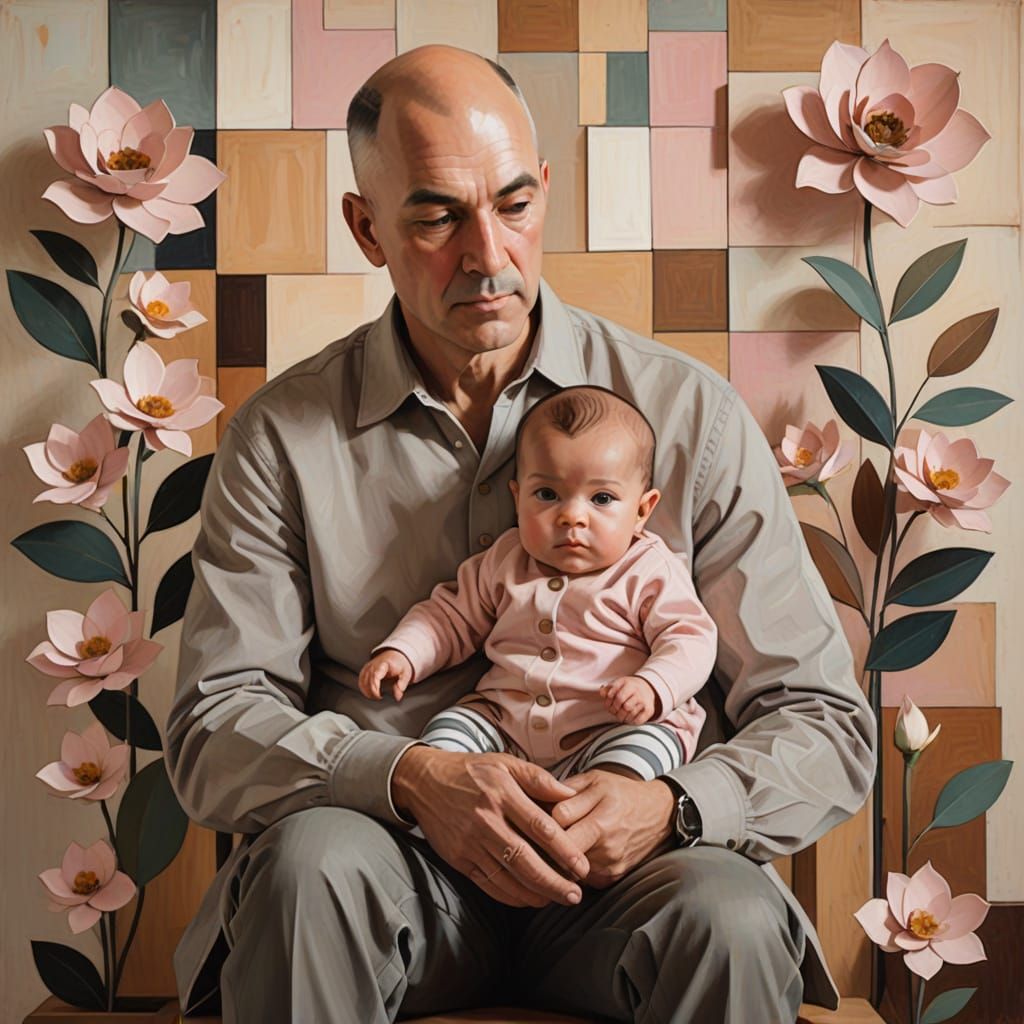 A heartwarming moment of fatherly love, captured in a cozy, intimate scene with soft, rounded geometric shapes and gentle light.