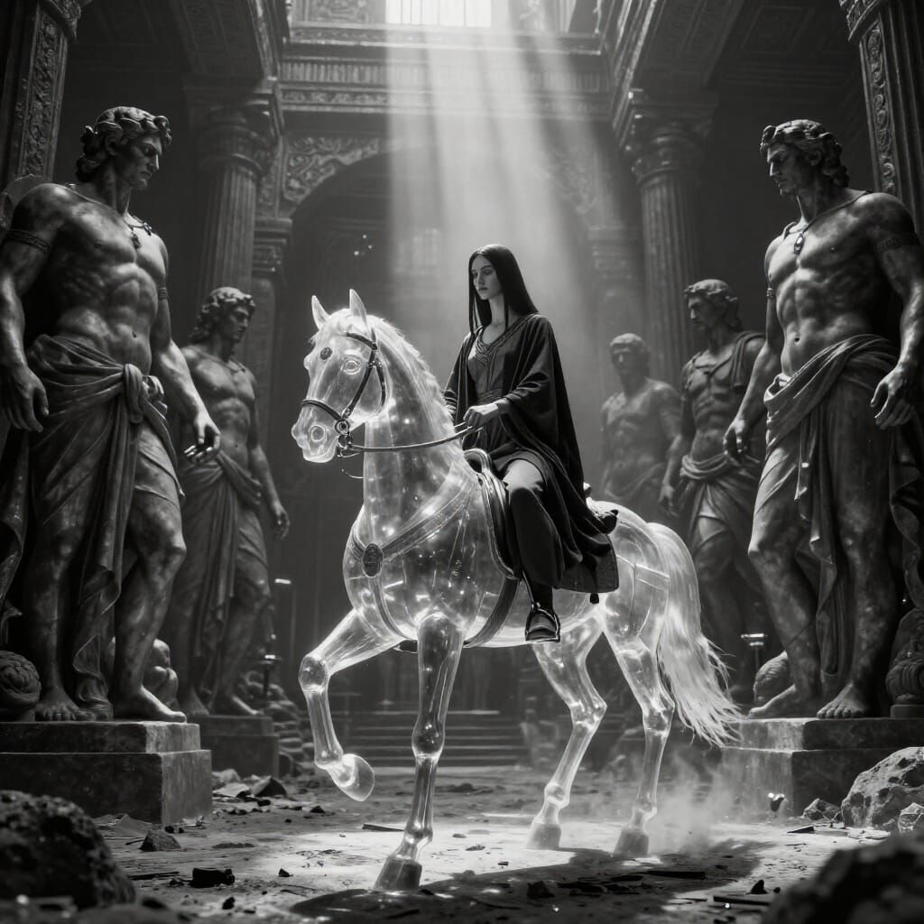 michelangelo painting style, statues guys around, beautiful armenian woman with ultra straight hair, very connected spiritual, riding transparent pur sang horse in the epic road of city of shamballah in background with third eye, ray of lights between characters, ultra deep contrast, ROMA, monochromatic ...