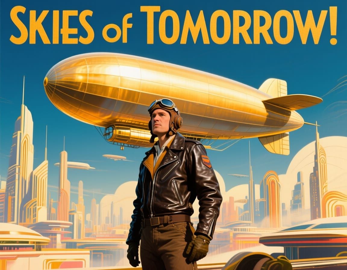 A striking picture of a pilot in a leather jacket posing in front of a zeppelin. The scene is set above a futuristic city in an art deco style, with golden light and vibrant colors.