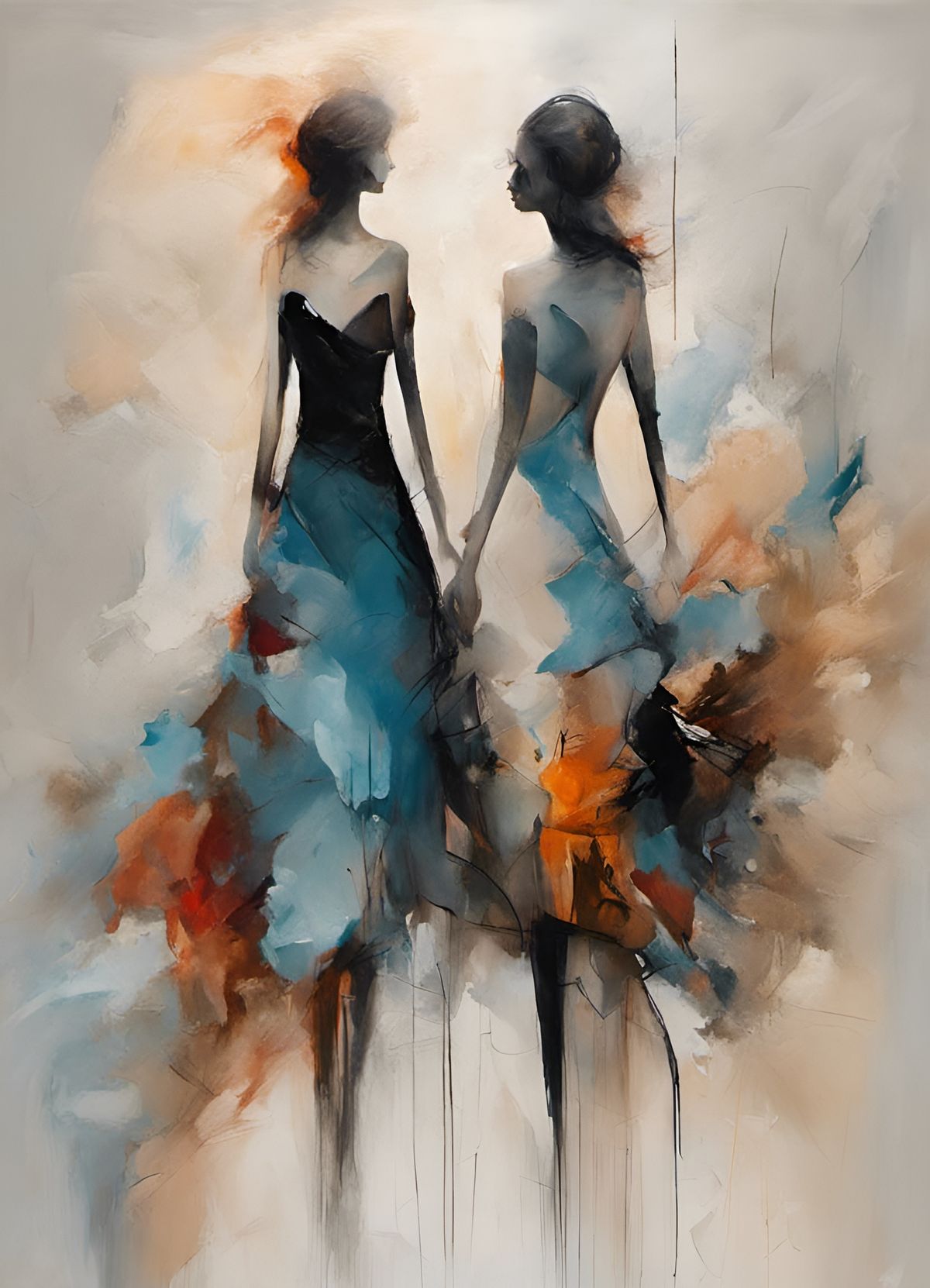 This image shows two women in an abstract figurative art style. The figures are reminiscent of Valentina Remenar's style with distorted forms and vibrant colors.