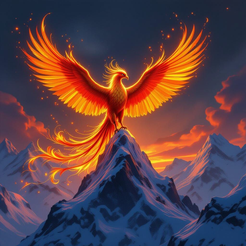 This image shows a majestic phoenix made of molten gold and embers on a crystal mountain. Its warm glow illuminates the icy landscape in vibrant hues, created in a hyper-realistic fantasy digital painting style.