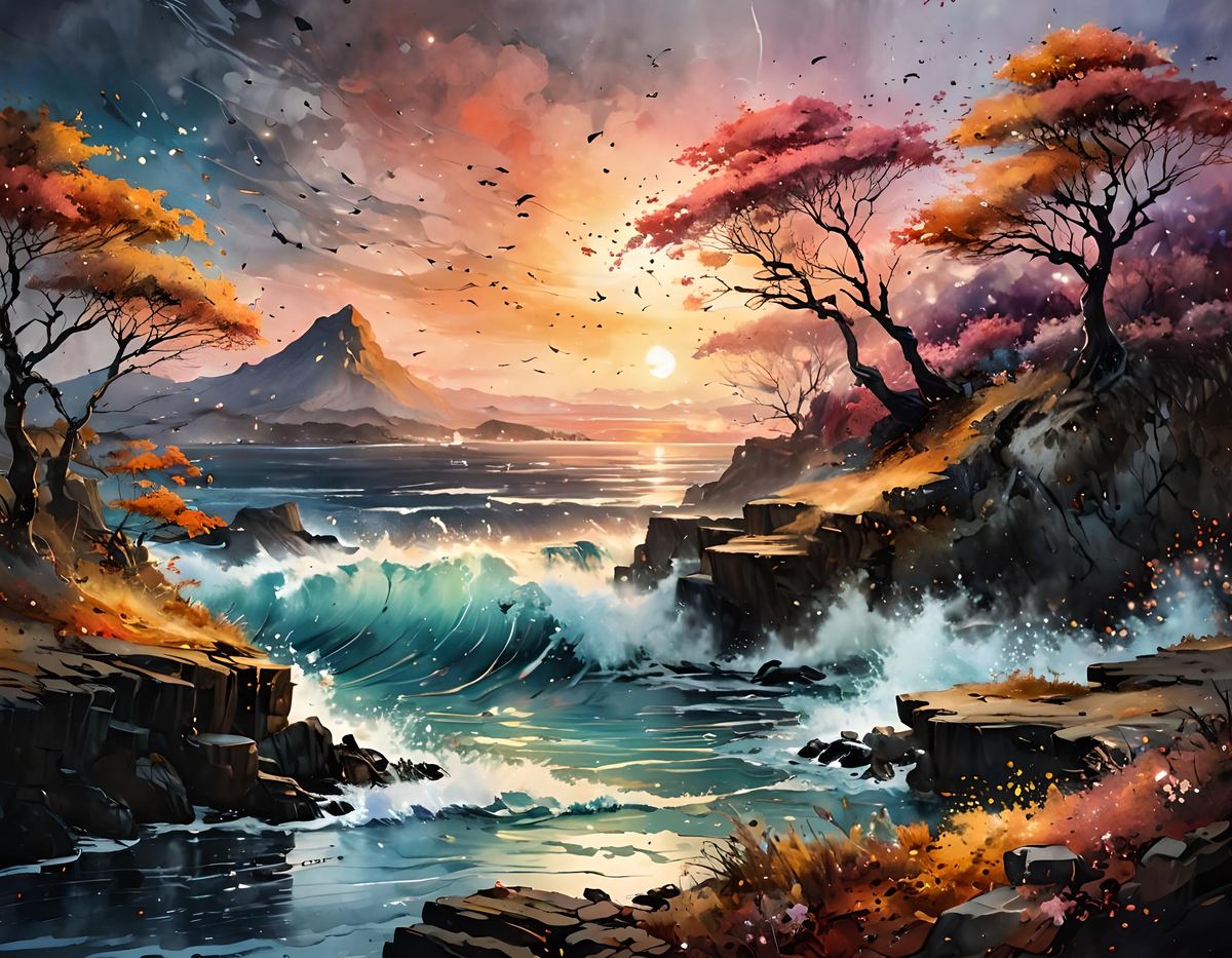 This image shows a twilight sky filled with swirling colors and mystic fog, illuminated by a dramatic sunset. The artwork features a cinematic style with autumn colors and amazing lighting.