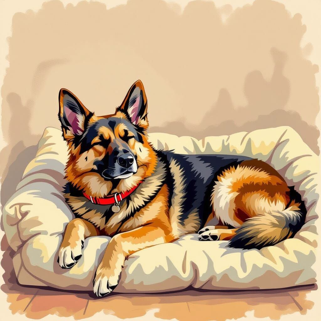 This image depicts a relaxed German Shepherd asleep on a dog bed. The artwork conveys a cozy, inviting atmosphere with whimsical and playful touches in a digital art style.