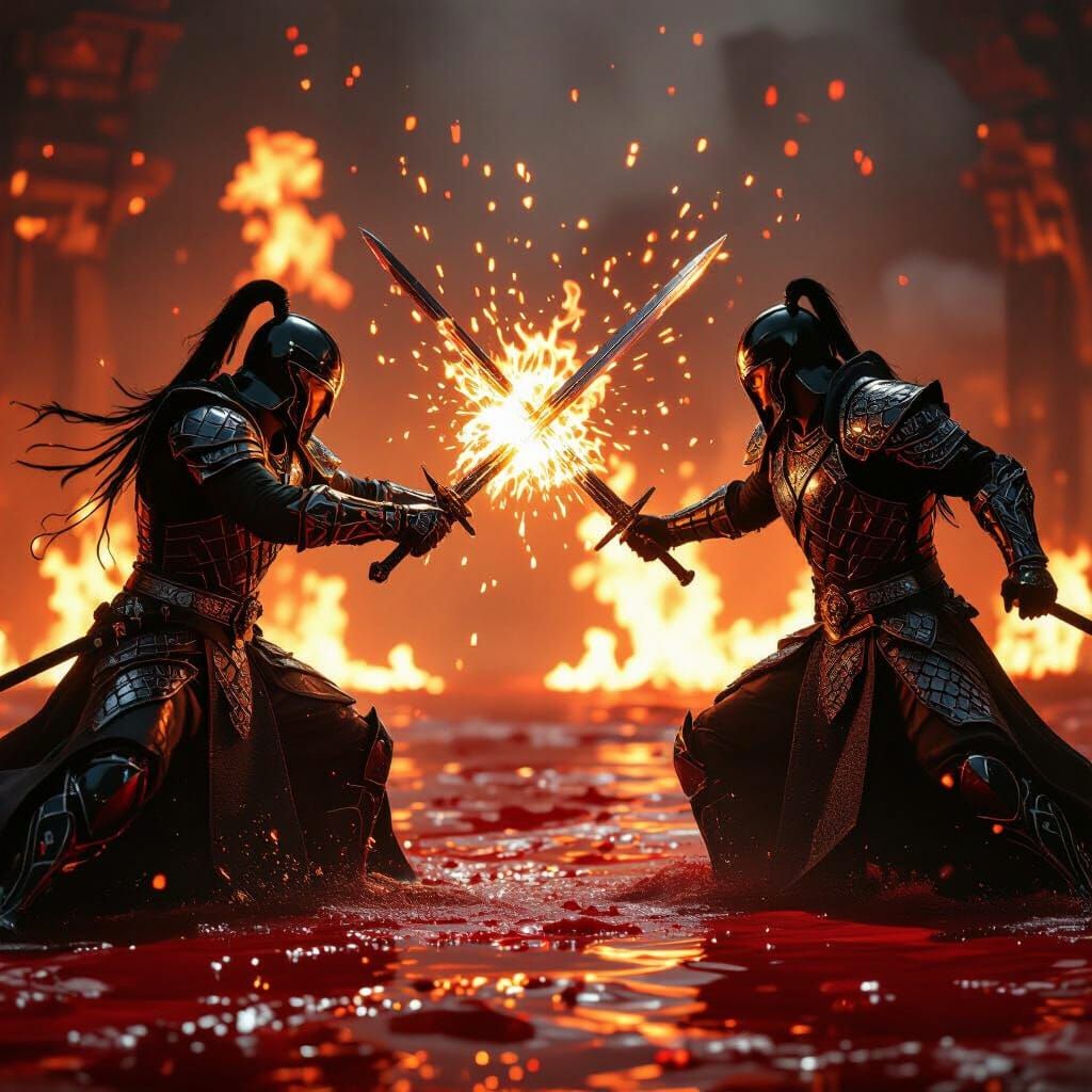Photorealistic, 8K, cinematic scene: Two legendary warriors in shiny black, diamond-encrusted costumes engage in a fierce sword fight. Fire erupts with every clash of their blades, casting dynamic shadows. The ground beneath them is entirely flooded with shimmering, deep red blood. Hyper-detailed, dramatic lighting, epic battle."