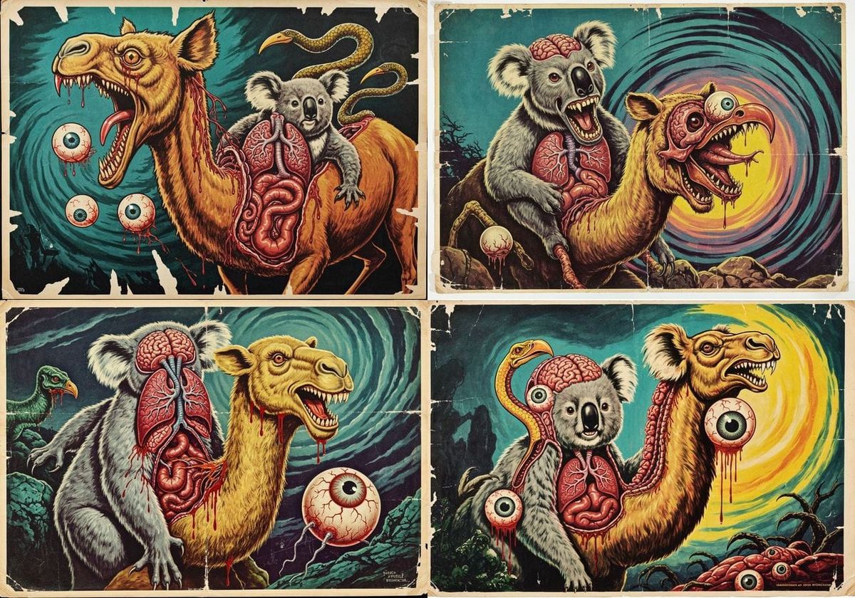 This image shows a grotesque mutant creature reminiscent of a vintage B-movie poster. The surreal horror scene features lurid colors, exaggerated shadows, and tattered edges, creating a horrific, chaotic spectacle.