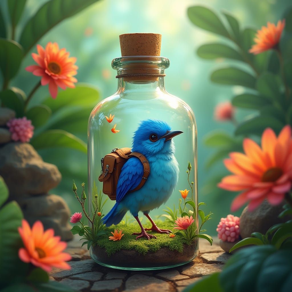 This image shows a blue bird enjoying a vibrant tropical paradise inside a glass bottle. Intricate details and soft, warm lighting capture a whimsical scene with lush greenery and colorful flowers.