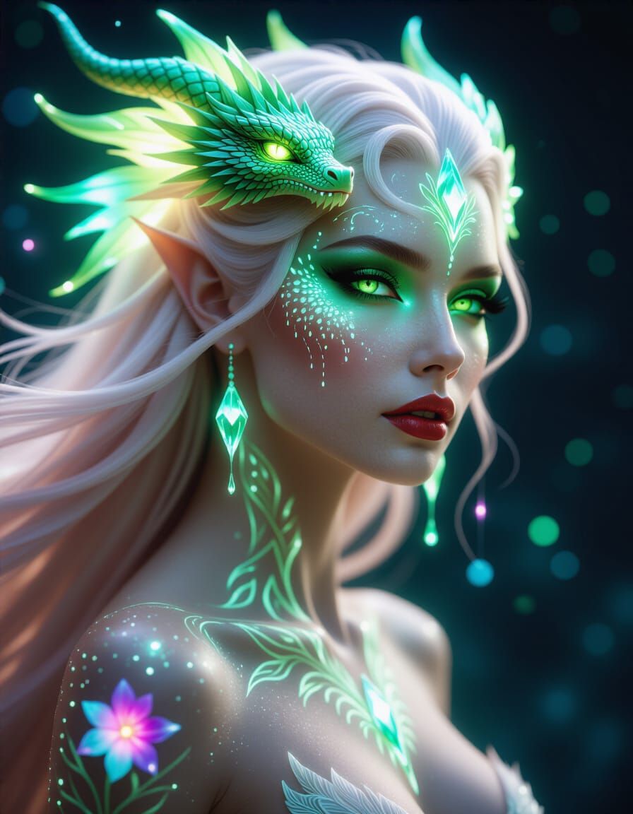 A striking picture of a cosmic dragon goddess with flowing hair and emerald scales. The image features luminous skin, intricate body art, and neon highlights in a psychedelic fractal design.