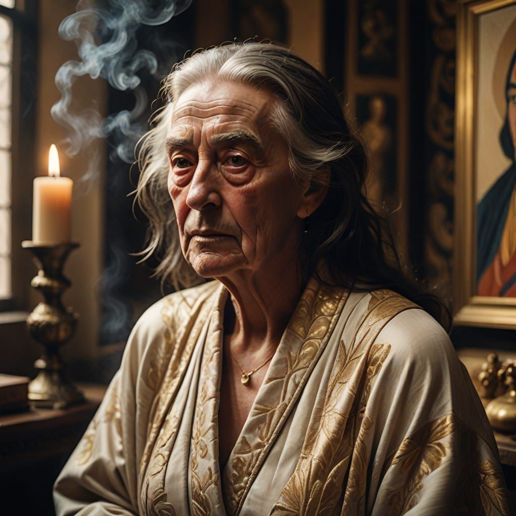 This image shows a sensual, hazy portrait of an elderly transvestite in a temple brothel, surrounded by whispers of Art Nouveau elegance and soft pastels, evoking a masterpiece of surrealism.