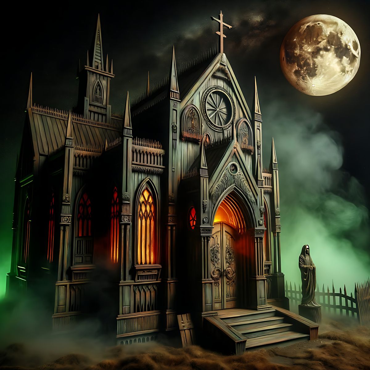 A sinister haunted house designed like a grotesque mockery of a castle and a church. The front door is a solid plank of Stygian carved wood. The entire building emits a sickly greenish-yellow glow. Shot at night. A large blood moon hangs low in the sky, and the sky itself is blacker than black. Lovecraftian, ...
