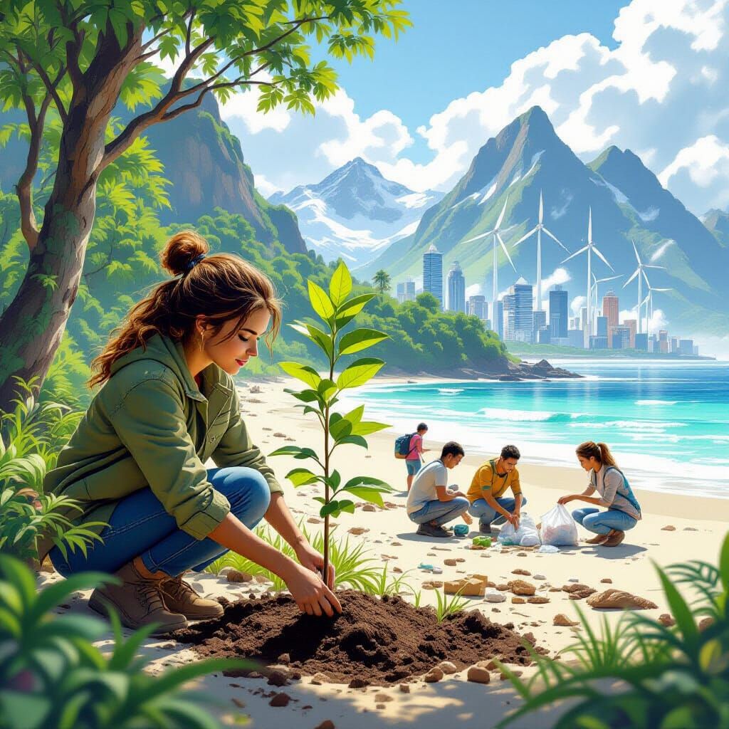 This image shows a young woman planting a tree as volunteers clean a beach. A mountain range and futuristic city with renewable energy complete this hyperrealistic scene.