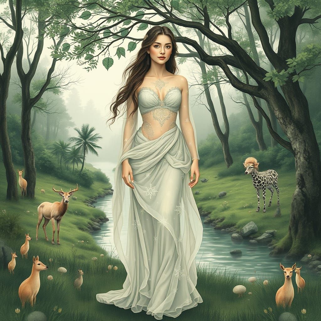 This image shows a Botticelli-esque woman in flowing attire with starlight patterns, set in a lush forest with animals and a river. The artwork features a soft, pastel monochrome watercolor aesthetic with Qajar art details.