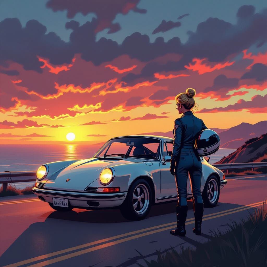 A lone female race car driver stands with a gleaming vintage Porsche 911 at a coastal overlook during sunset. The scene features dramatic shadows and warm, golden light, rendered in a classic comic book art style with bold outlines.