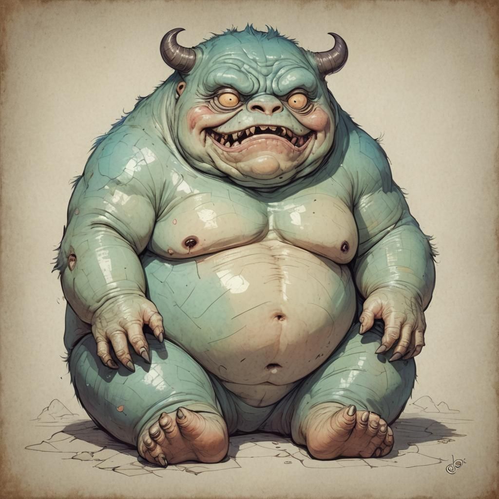 A soft pastel drawing of a furry, rounded monster with large, sparkling eyes. The creature sits near a coffee cup in a pop surrealist graphite style, with blurred and delicate details.