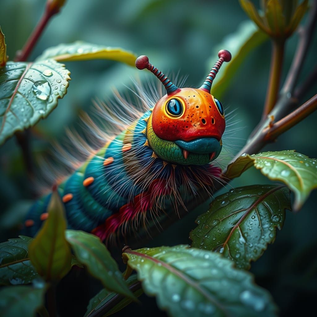 A vibrant caterpillar is seen among dewy leaves. The image is a photorealistic digital artwork with intricate textures and details, creating a luxurious and engaging scene.