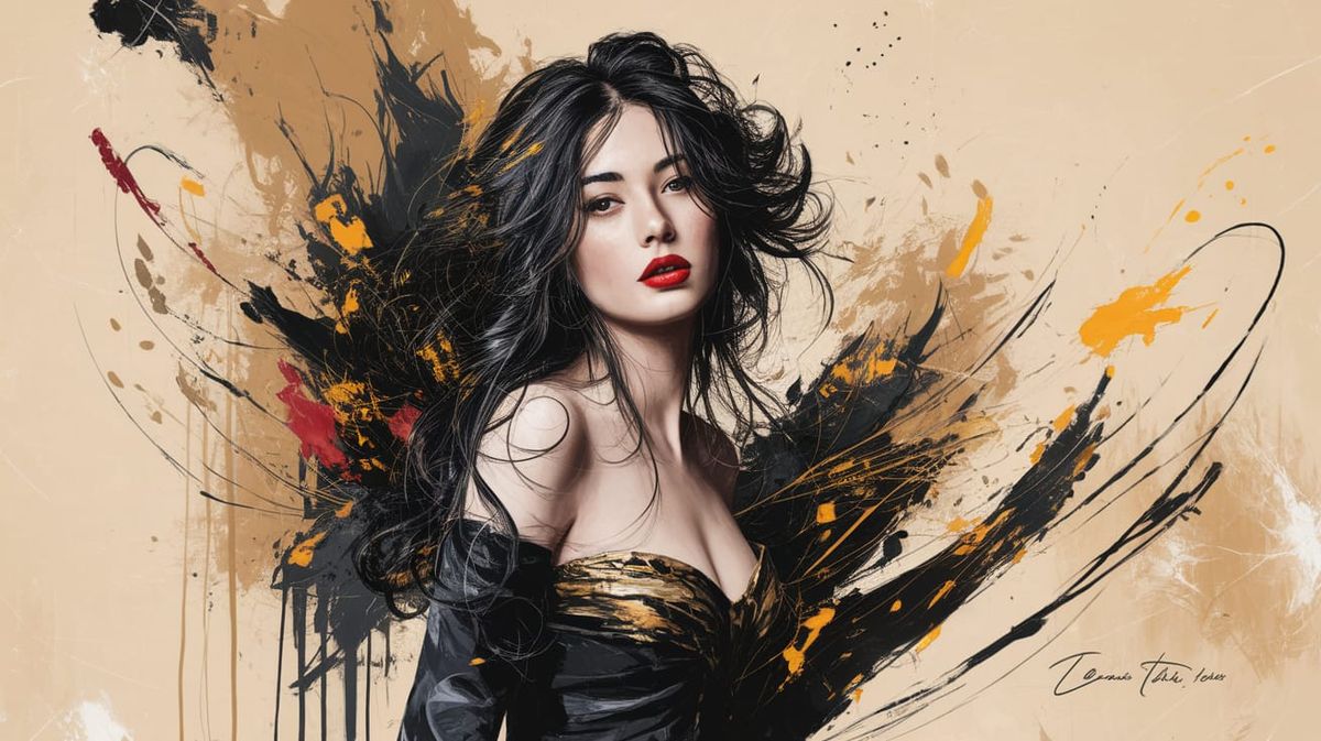 A striking picture of a woman with dark hair and red lipstick. She wears a black and gold dress, standing against a beige backdrop with splashes of color. The digital art has a dreamy, ethereal quality.