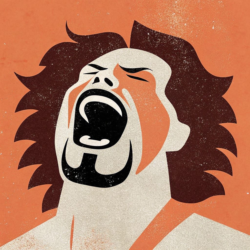 This image depicts a man screaming, rendered in a detailed charcoal drawing style. The artwork captures raw emotion through expressive lines and shading.