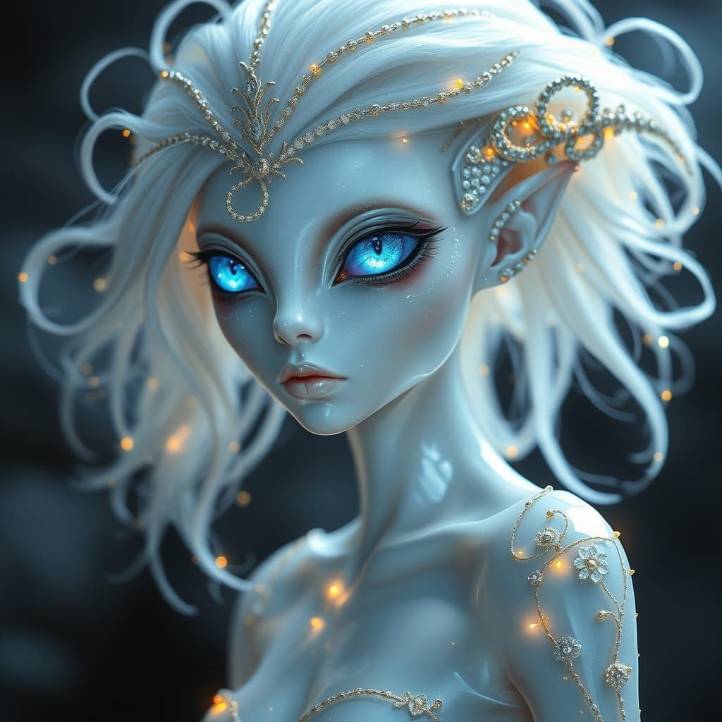 This image shows an ethereal alien woman with galaxy eyes and a transparent body. The figure is tall and adorned with glowing runes, set against a cosmic backdrop.