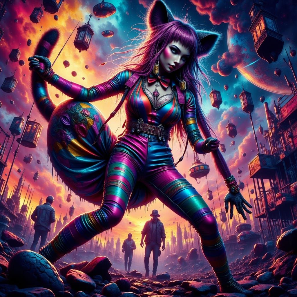 A vibrant ring-tailed lemur jester hangs upside down in a ruined carnival. The image, created in a pulp comic style, features neon rainbow colors and glitch art accents.