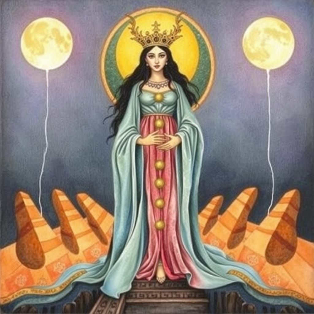This image shows a surreal tarot card in a low-contrast pastel watercolor style. The Queen of Pentacles is depicted in a surreal, melting style on a matte background.