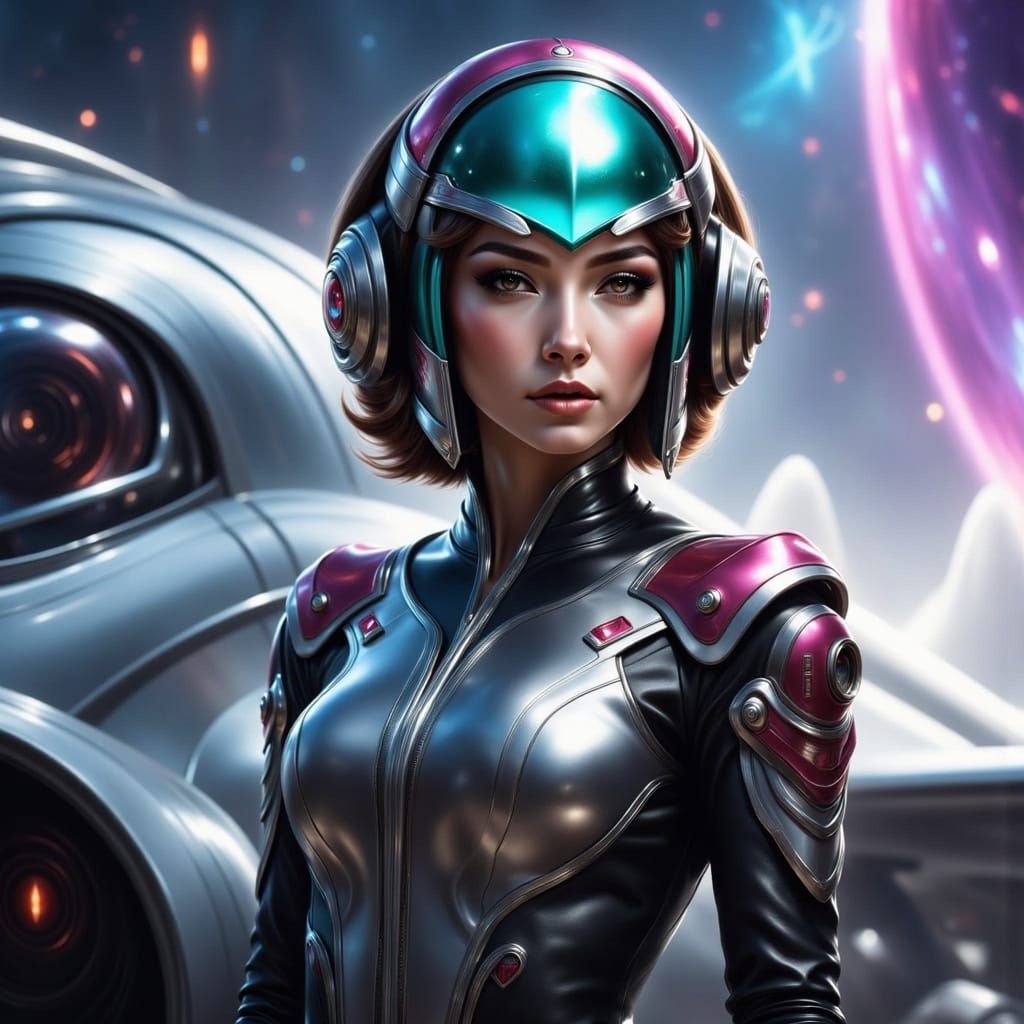 This concept art shows a determined female pilot in a glowing helmet and armored suit, standing by a sleek bomber. Cinematic lighting and vibrant colors enhance the futuristic, gritty atmosphere.