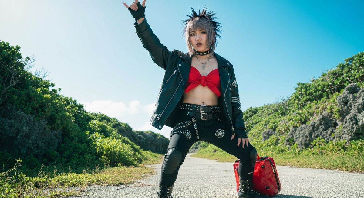 A vibrant image of a punk gyaru girl against a sunny Okinawa backdrop. The picture captures the dynamic energy of punk rock culture with a cinematic style.