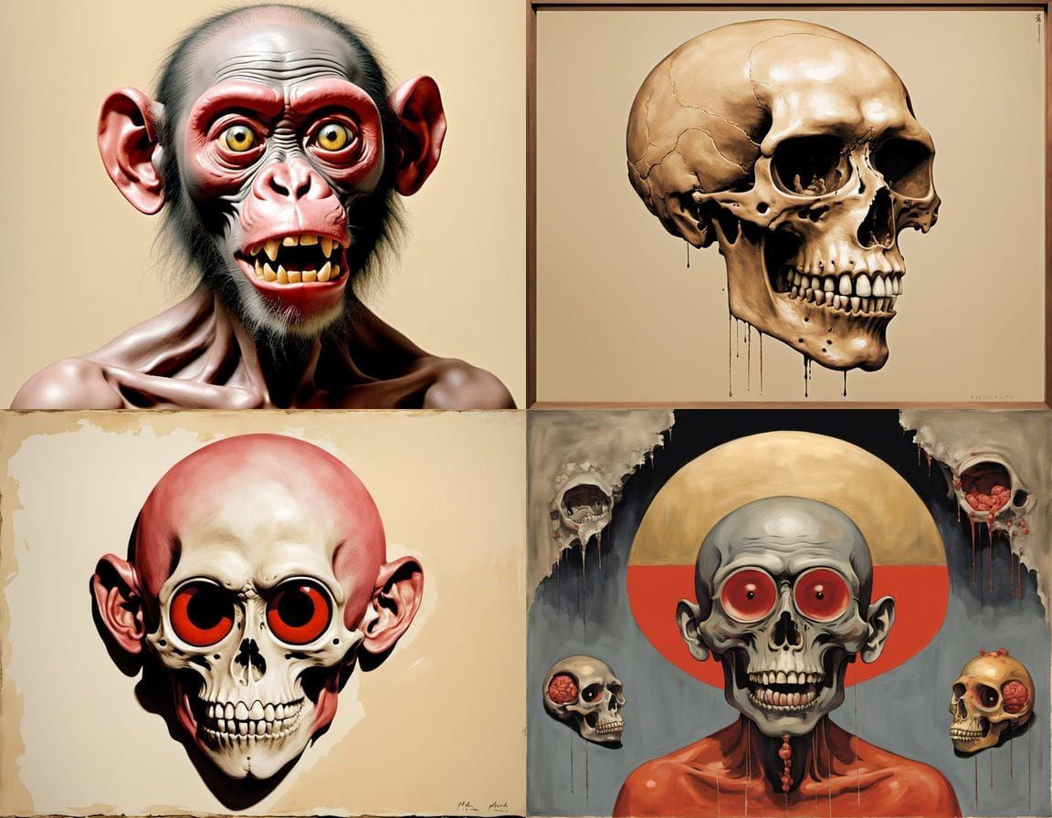 This image depicts a hyperdetailed sumi-e style horror scene featuring a grotesque homunculus with exposed brains and lungs, rendered in retro complimentary colors. A striking blend of Asian Art Deco and 1950s brutalist influences.