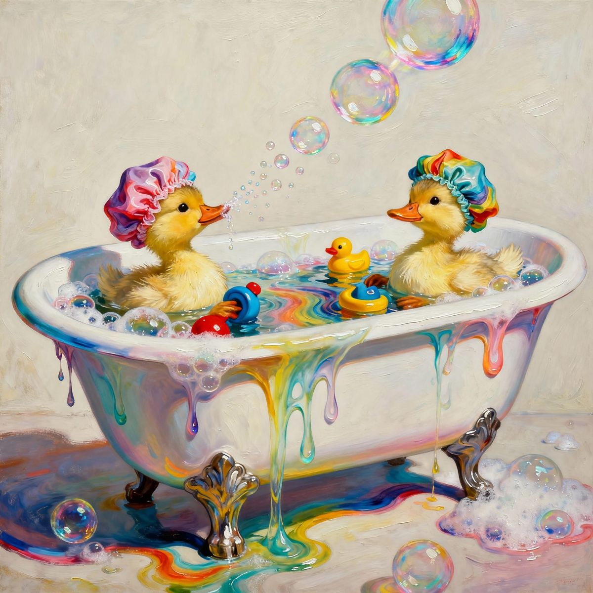A surrealist oil painting depicts fluffy baby ducks in shower caps swimming in a bathtub with rainbow bubbles. They play with toys in a dreamlike, vibrant atmosphere.