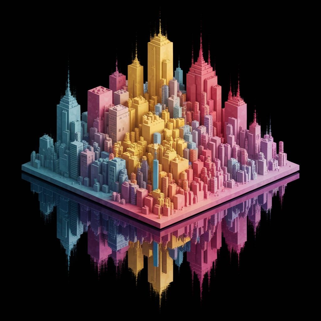 In a stunning watercolor cityscape, a futuristic, neocubist metropolis rises from a black background, its intricate architecture composed of circles, rectangles, squares, and triangles in vivid yellow and red hues against a backdrop of deep, complementary colors. This liminal space, inspired by the visionary styles of Syd Mead, H.R. Giger, and Ash Thorp, exudes a surreal, three-dimensional quality with a splash screen aesthetic reminiscent of Unreal Engine 5, capturing the essence of kidcore nostalgia and trending Artstation aesthetics.
