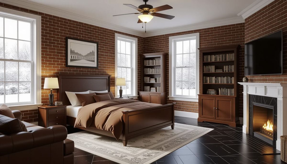 This image showcases a photorealistic Victorian bedroom, featuring a king-size bed, sofa, and brick wallpaper, illuminated by cinematic lighting for a warm, inviting atmosphere.