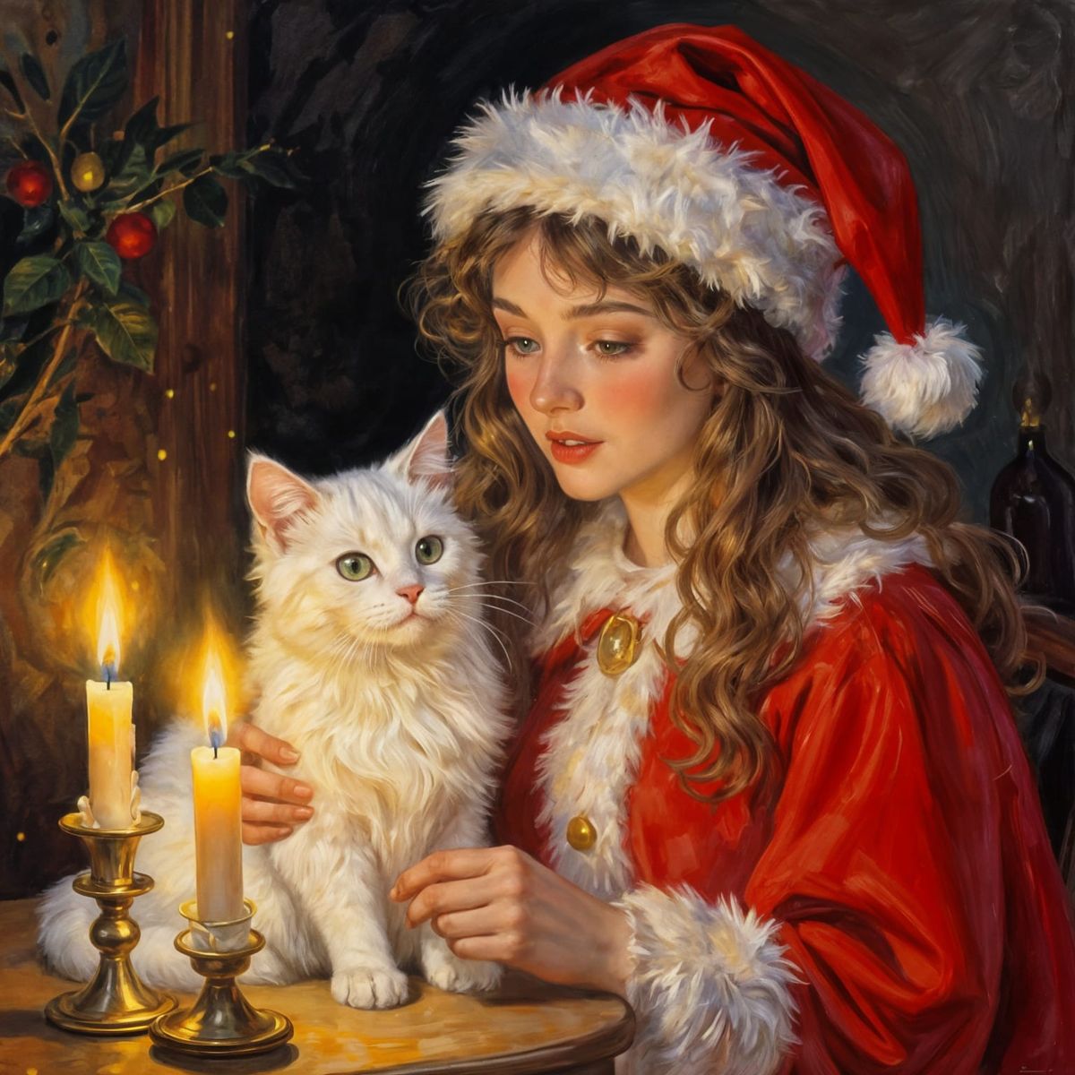 This image features a beautiful, unrealistic woman dressed as Santa Claus, accompanied by cats and candles. It's rendered as a detailed gouache painting.