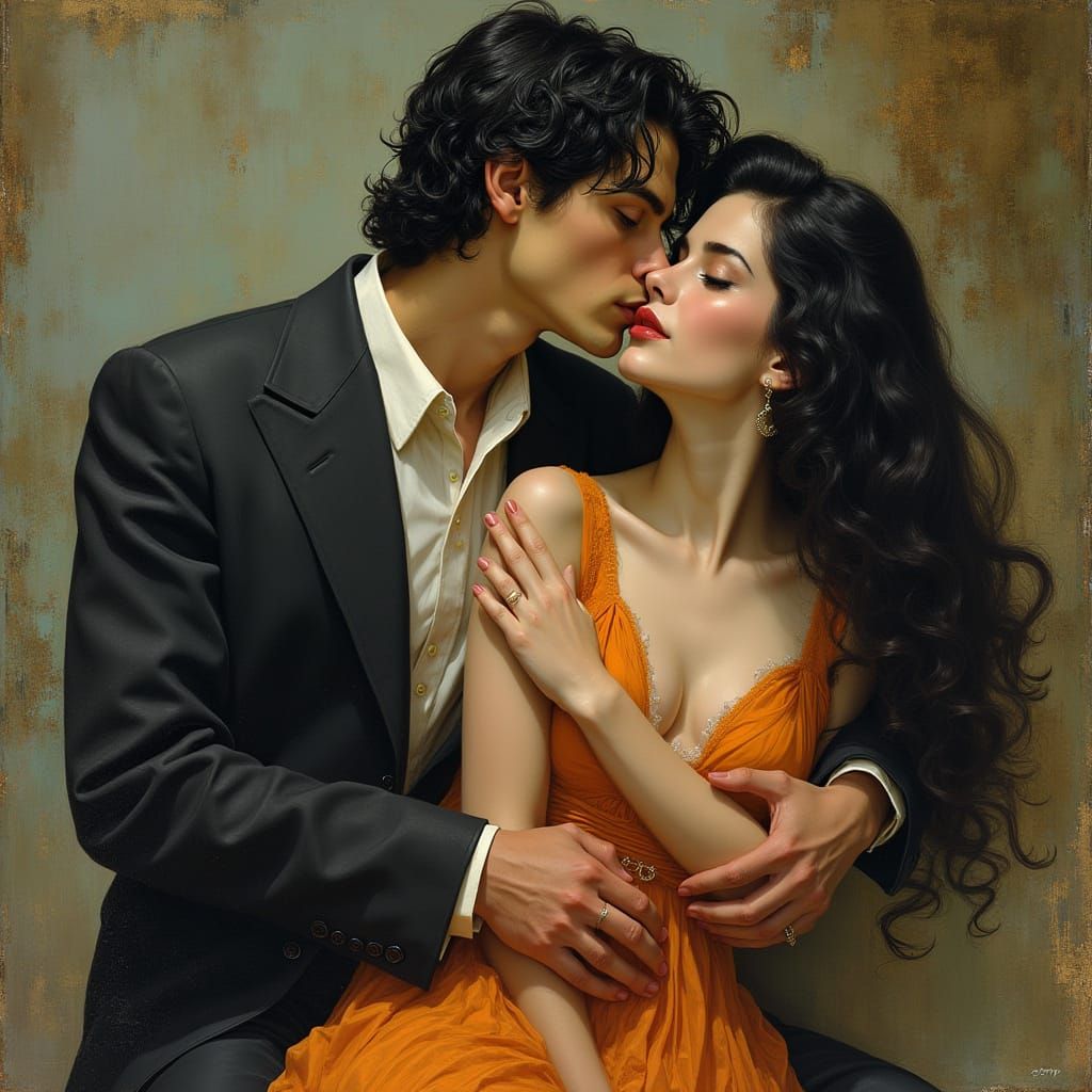 This image shows a portrait reminiscent of early 20th-century art. It combines elements of portraiture and decorative patterns in a style reminiscent of the Art Nouveau era.