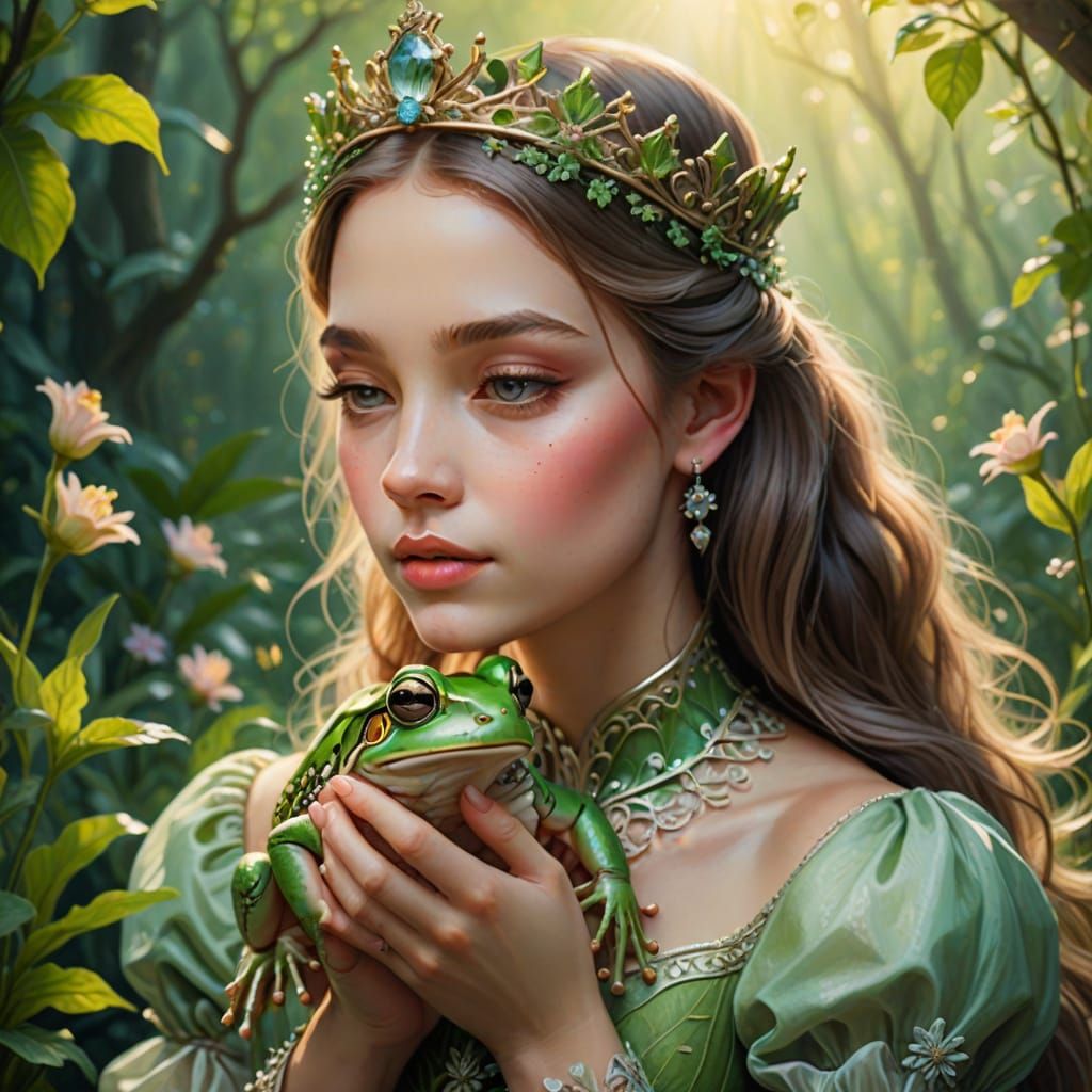This image shows a young princess gently kissing a frog. The scene is rendered in a whimsical fantasy art style, with soft focus, pastel colors, and lush foliage, creating a dreamy, romantic atmosphere.