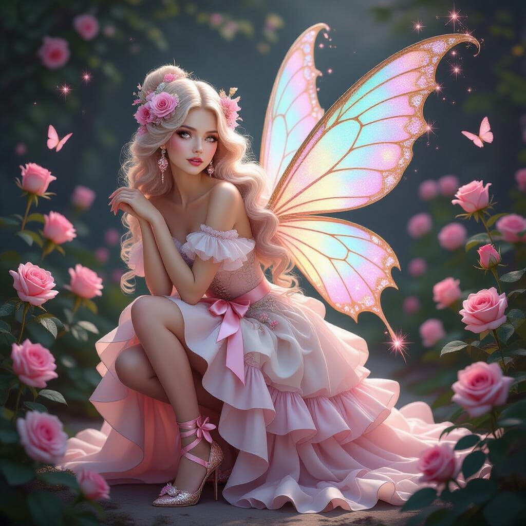 A stunning fantasy illustration of a graceful fairy dressed in soft shades of pink. She kneels delicately among blooming roses, surrounded by a glowing, dreamlike atmosphere. Her long, voluminous hair is styled in elegant curls, adorned with roses and floral ornaments. Sparkling pink and gold earrings shimmer as they catch the light.Her dress is an enchanting, layered gown with ruffled skirts in shades of blush and white, cinched with a pink satin ribbon tied into a bow at the back. She wears glamorous high-heeled shoes in shimmering pink, detailed with ribbons that wrap around her ankles.Her wings are large, translucent, and iridescent, glowing with delicate pastel hues of pink, gold, and soft lavender. They sparkle faintly in the ambient light. Around her, butterflies flutter gracefully, and glowing particles drift through the air, adding to the magical scene.The background is filled with roses and a radiant pastel glow, enhancing the fairytale elegance.
