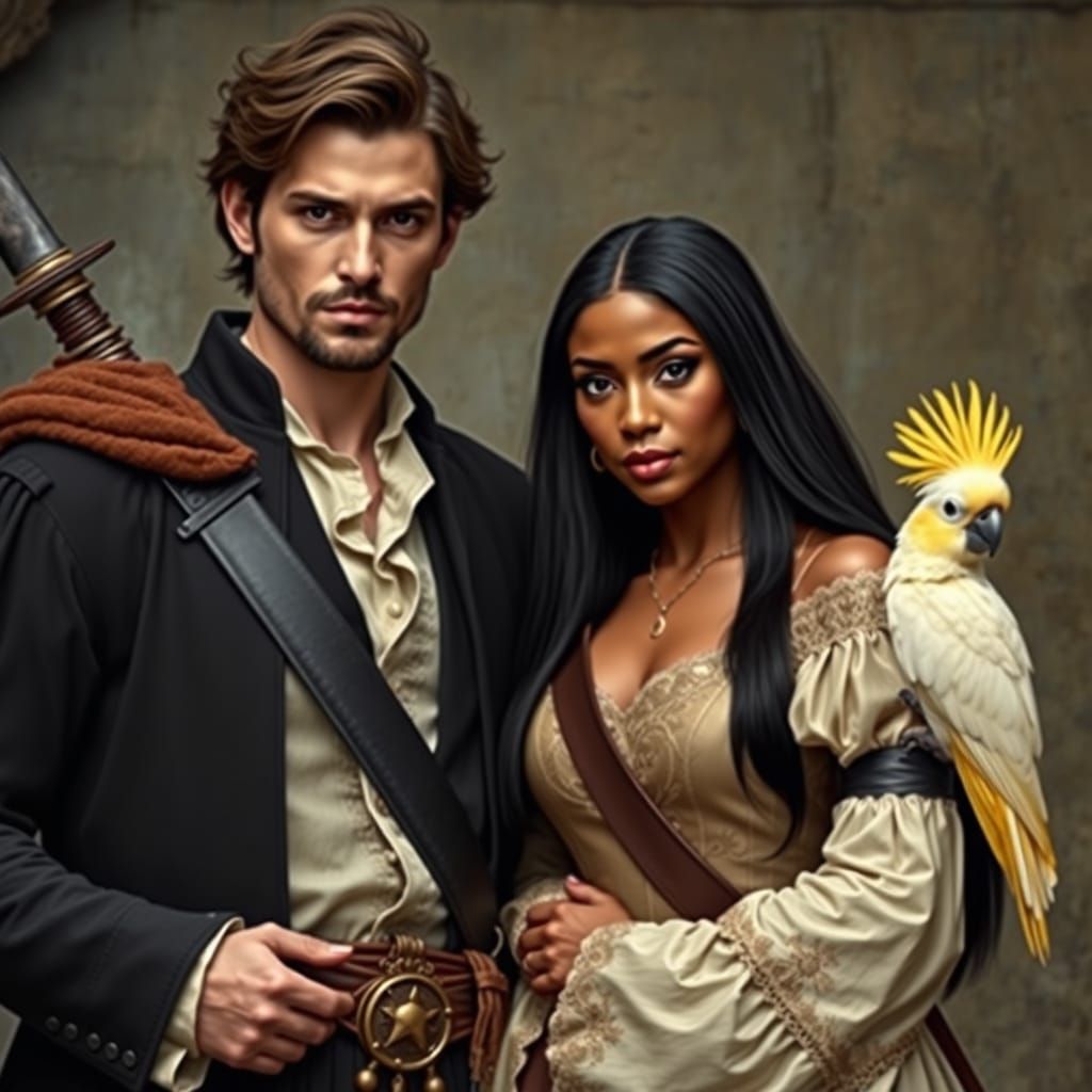 This image shows a couple from a fantasy world, set against a backdrop reminiscent of the 17th century. The dark-haired warlock and his enchantress companion, with striking black hair, are accompanied by a sulphur-crested cockatoo. The scene is steeped in mystery and adventure.