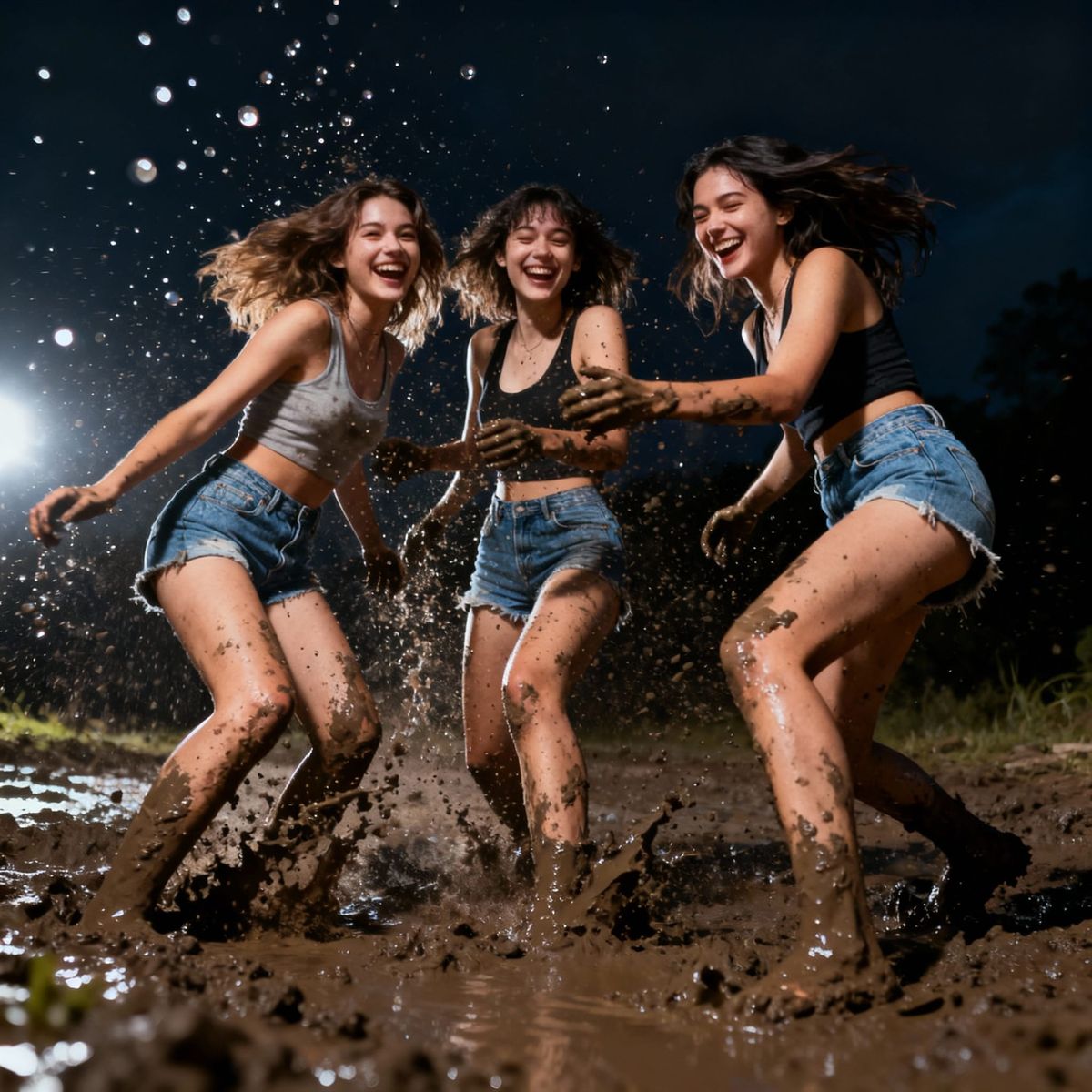 This photorealistic image shows three young women in denim shorts joyfully playing in mud, captured with dramatic lighting and emphasizing dynamic action and splashes.