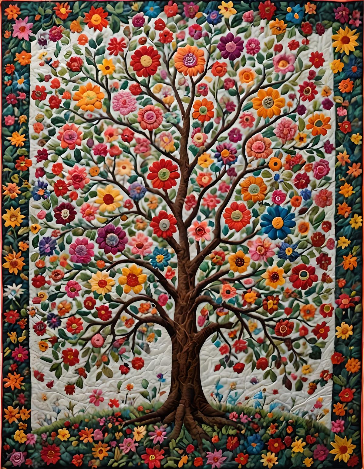 This image shows a vividly colored quilt depicting a tree covered in flowers. The intricate details and realistic textures create a visually appealing and unique design.