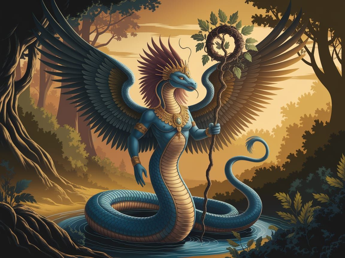 A striking picture of Ningishzida, a majestic serpentine deity with feathered wings, emerging from an ancient forest. The deity is adorned with gold jewelry and holds a staff, all bathed in warm, ethereal light.