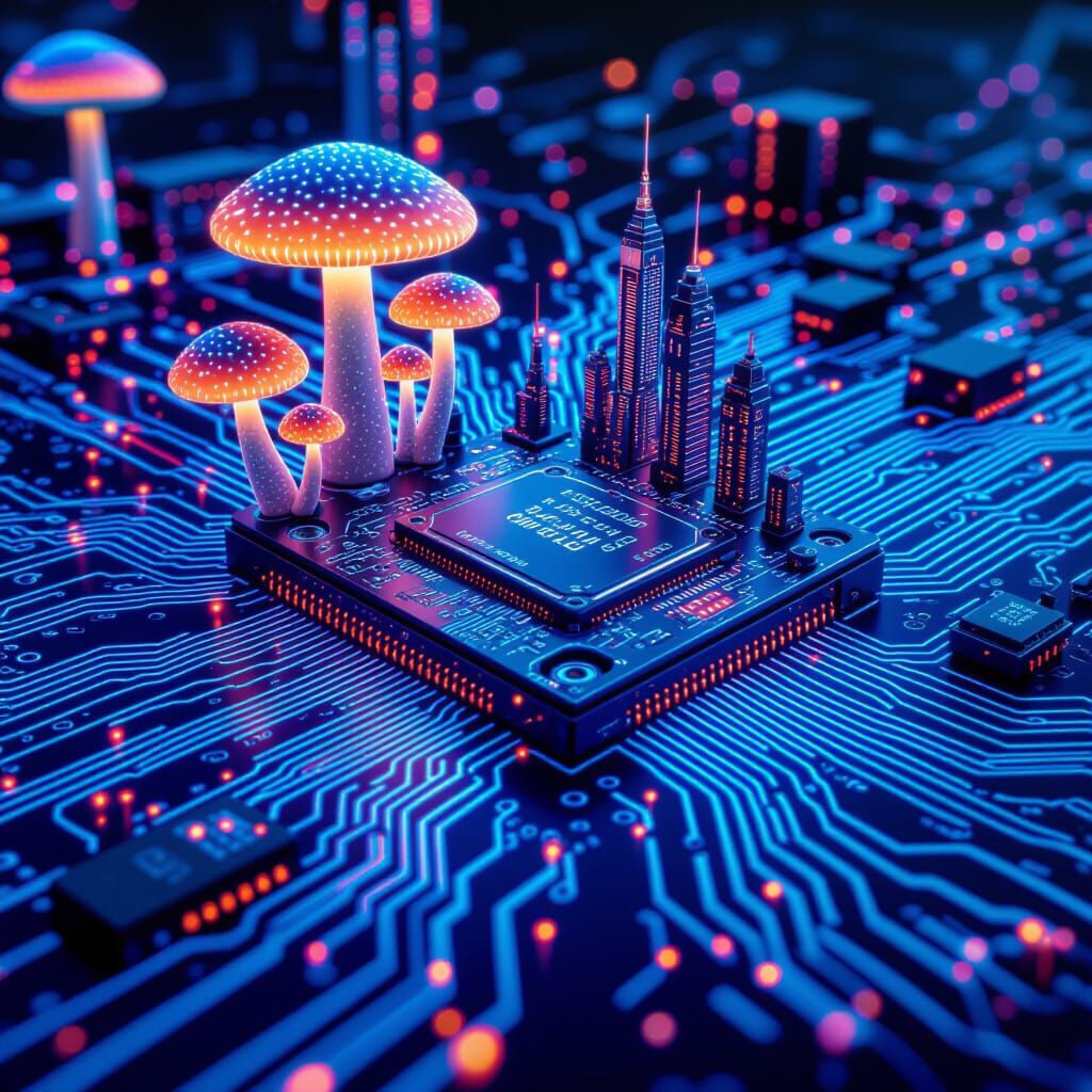 This image showcases a detailed, surreal fantasy city of mushrooms constructed upon a close-up view of a motherboard, rendered with blue, silver, and orange hues.