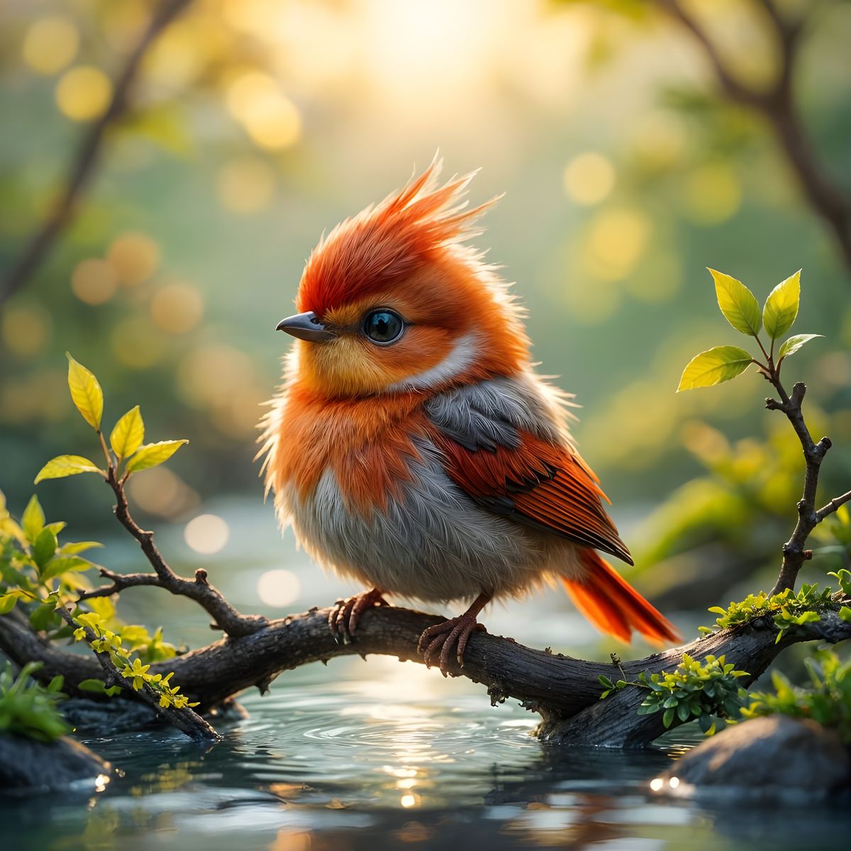 This image shows a vibrant, 3D rendered baby bird with fire-red plumage perched on a bonsai branch near a creek, bathed in sunlight. The scene is rendered as abstract art with complementary colors.